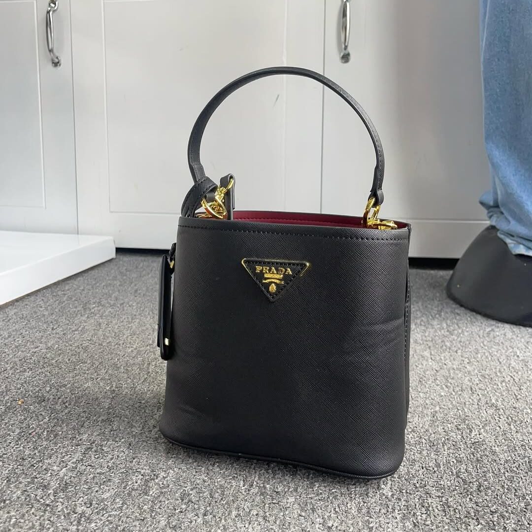Prada Small Saffiano Leather Panier Bag is a sleek and structured mini bag crafted from durable saffiano leather, featuring clean lines, gold-tone hardware, and Prada’s signature triangle logo—perfect for elegant everyday wear.
