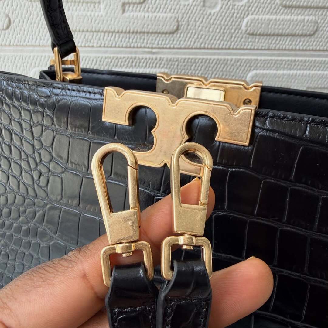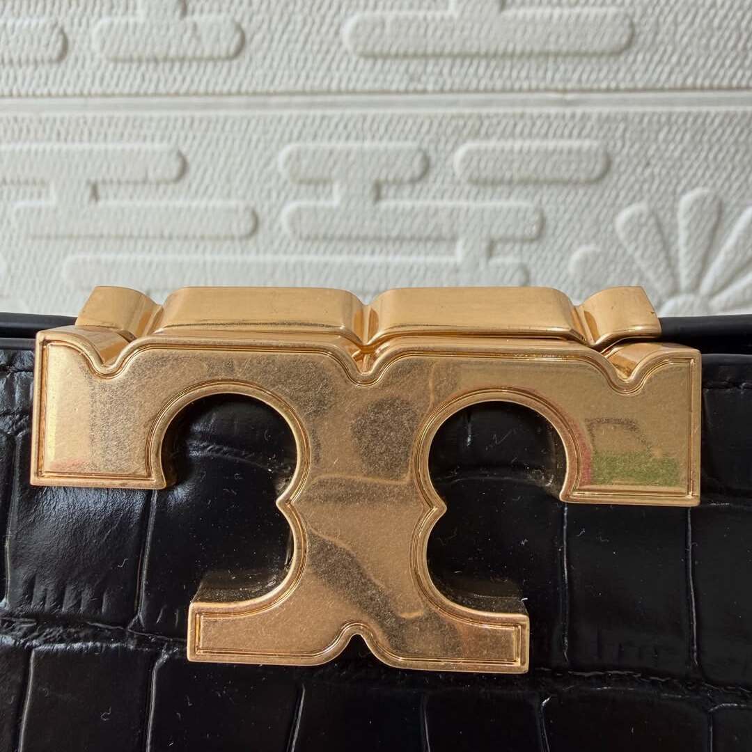 The Tory Burch Eleanor represents the absolute pinnacle of the brand’s luxury evolution. This archival piece is meticulously crafted from premium croc-embossed leather, hand-finished to a high-shine luster that accentuates the deep, symmetrical scale pattern. With its rigid, architectural silhouette and “jewelry-inspired” hardware, the Eleanor is a masterpiece reserved for those who demand a commanding presence in their archival rotation.
